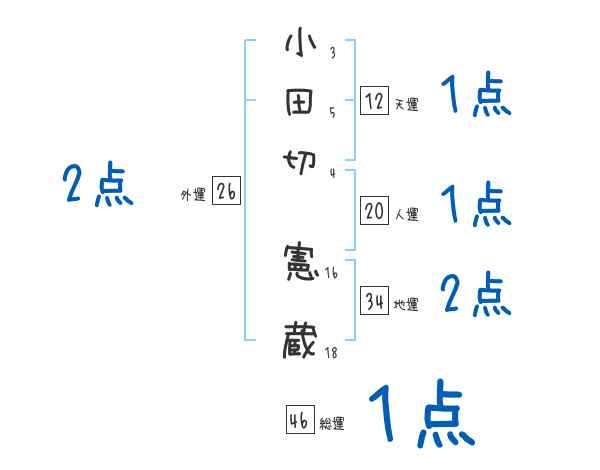 外運![]() | 小田切憲蔵さんの外運は26画の2つ星!波瀾万丈かも。信頼できる人を大事にしましょう。 生活面を象徴する運勢です。外部から受ける影響力を表し、結婚運、家庭運や職場、環境への順応性を表します。 |