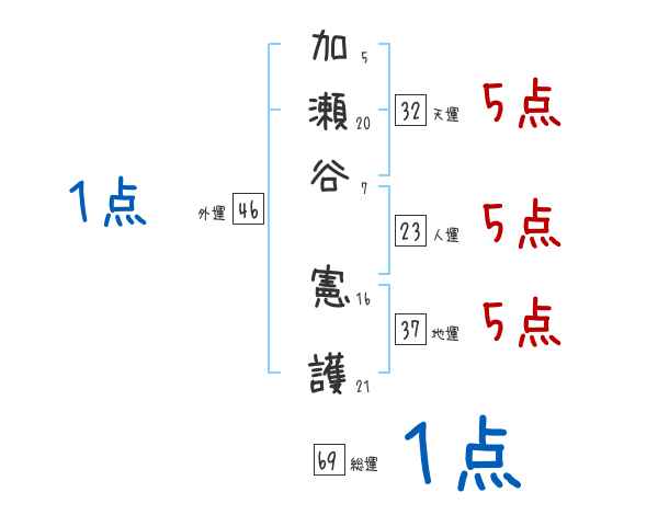 総運![]() | 加瀬谷憲護さんの総運は69画の1つ星!不満を感じやすい傾向が。ストレスを貯めないように注意しましょう。 あなたの人生を表す1番重要な運勢です。生涯を通じて影響する総合運となり、主に50歳以降の晩年期に影響を及ぼします。 |