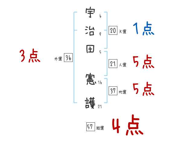 外運![]() | 宇治田憲護さんの外運は36画の3つ星!先見性が豊かです。多少神経質で苦労することも。 生活面を象徴する運勢です。外部から受ける影響力を表し、結婚運、家庭運や職場、環境への順応性を表します。 |