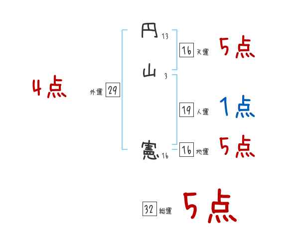 総運![]() | 円山憲さんの総運は32画の5つ星!柔軟性があり成功する。チャンスが多く金運が良い。 あなたの人生を表す1番重要な運勢です。生涯を通じて影響する総合運となり、主に50歳以降の晩年期に影響を及ぼします。 |