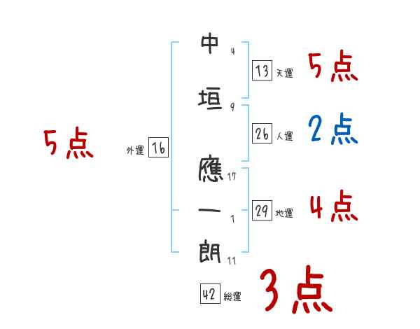 | 外運  | 中垣應一朗さんの外運は16画の5つ星!人望が厚く大きく発展する。逆転成功が見える。生活面を象徴する運勢です。外部から受ける影響力を表し、結婚運、家庭運や職場、環境への順応性を表します。 |