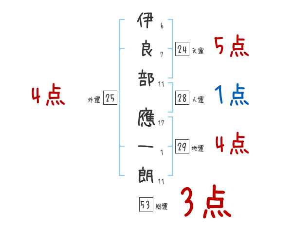 総運![]() | 伊良部應一朗さんの総運は53画の3つ星!やや見栄っ張りで虚栄心がある。散財に注意。 あなたの人生を表す1番重要な運勢です。生涯を通じて影響する総合運となり、主に50歳以降の晩年期に影響を及ぼします。 |