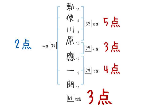 天運![]() | 勅使川原應一朗さんの天運は32画の5つ星!柔軟性があり成功する。チャンスが多く金運が良い。 家系が持つ宿命的な運勢を表します。祖先から受け継いだ苗字ですので自分の力が及びません。家柄を象徴します。 |