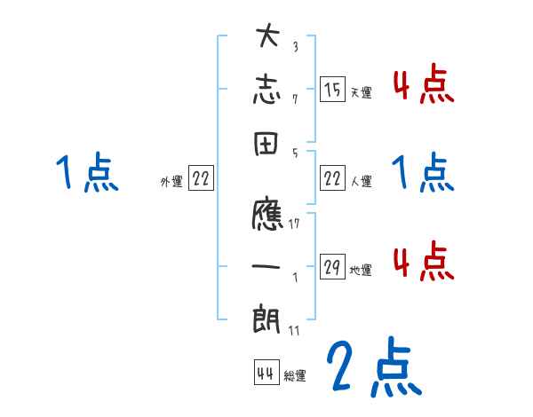 総運![]() | 大志田應一朗さんの総運は44画の2つ星!誠実で慎重な性格。物事を考えすぎないように注意しましょう。 あなたの人生を表す1番重要な運勢です。生涯を通じて影響する総合運となり、主に50歳以降の晩年期に影響を及ぼします。 |