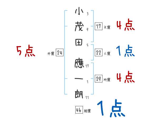 総運![]() | 小茂田應一朗さんの総運は46画の1つ星!迷走することが多く苦労するかも。目先のことにとらわれないように。 あなたの人生を表す1番重要な運勢です。生涯を通じて影響する総合運となり、主に50歳以降の晩年期に影響を及ぼします。 |