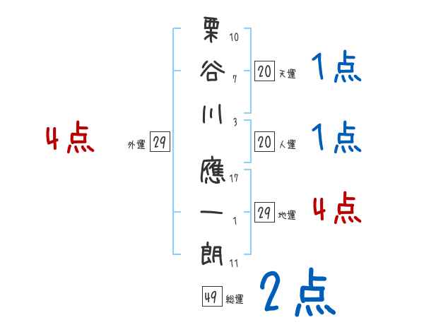 外運![]() | 栗谷川應一朗さんの外運は29画の4つ星!完全主義で才能がある。厳格な心の持ち主。 生活面を象徴する運勢です。外部から受ける影響力を表し、結婚運、家庭運や職場、環境への順応性を表します。 |