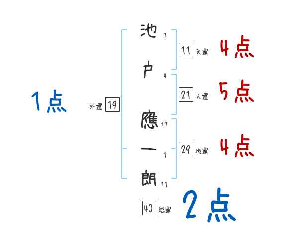 外運![]() | 池戸應一朗さんの外運は19画の1つ星!優れた才能を持ちますが、協調性が足りないことも。周りの人と協力する事を意識しましょう。 生活面を象徴する運勢です。外部から受ける影響力を表し、結婚運、家庭運や職場、環境への順応性を表します。 |
