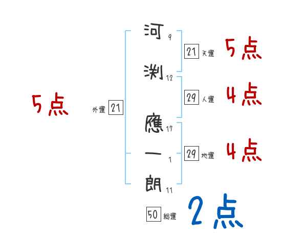 外運![]() | 河渕應一朗さんの外運は21画の5つ星!統率力がある。独立し成功する。名誉を手に入れる。 生活面を象徴する運勢です。外部から受ける影響力を表し、結婚運、家庭運や職場、環境への順応性を表します。 |