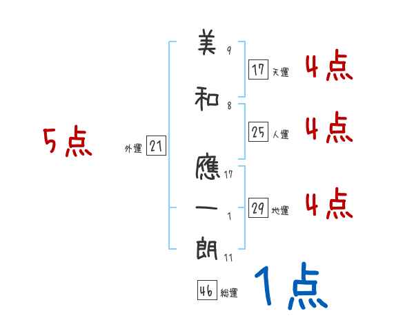 天運![]() | 美和應一朗さんの天運は17画の4つ星!積極的な行動力。地位を気づき財産を手に入れる。純粋な心と直感力。 家系が持つ宿命的な運勢を表します。祖先から受け継いだ苗字ですので自分の力が及びません。家柄を象徴します。 |