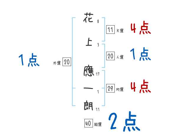 天運![]() | 花上應一朗さんの天運は11画の4つ星!着実に富や地位を得る幸運な人生。 家系が持つ宿命的な運勢を表します。祖先から受け継いだ苗字ですので自分の力が及びません。家柄を象徴します。 |