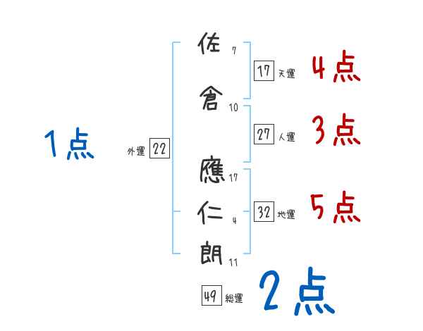 外運![]() | 佐倉應仁朗さんの外運は22画の1つ星!努力することが苦手ないっぽう手先が器用。芸術性にも優れる。 生活面を象徴する運勢です。外部から受ける影響力を表し、結婚運、家庭運や職場、環境への順応性を表します。 |