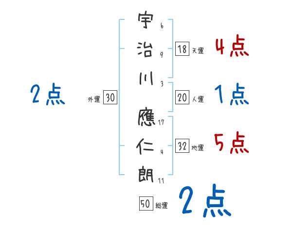 天運![]() | 宇治川應仁朗さんの天運は18画の4つ星!情熱的で剛気。忍耐力があり信頼される。 家系が持つ宿命的な運勢を表します。祖先から受け継いだ苗字ですので自分の力が及びません。家柄を象徴します。 |