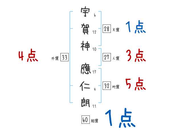 外運![]() | 宇賀神應仁朗さんの外運は33画の4つ星!権力志向でプライドが高い。勇気があり運を切り開き成功する。 生活面を象徴する運勢です。外部から受ける影響力を表し、結婚運、家庭運や職場、環境への順応性を表します。 |