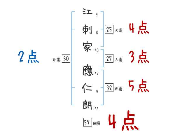 総運![]() | 江刺家應仁朗さんの総運は57画の4つ星!向上心があり人望がある。地位を得る。 あなたの人生を表す1番重要な運勢です。生涯を通じて影響する総合運となり、主に50歳以降の晩年期に影響を及ぼします。 |