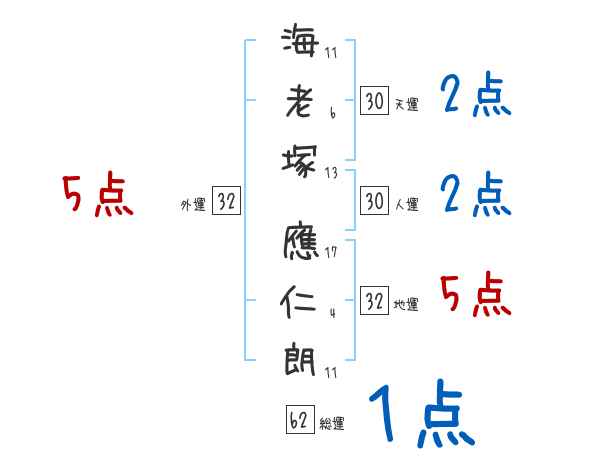 外運![]() | 海老塚應仁朗さんの外運は32画の5つ星!柔軟性があり成功する。チャンスが多く金運が良い。 生活面を象徴する運勢です。外部から受ける影響力を表し、結婚運、家庭運や職場、環境への順応性を表します。 |