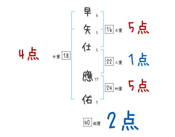 外運![]() | 早矢仕應佑さんの外運は18画の4つ星!情熱的で剛気。忍耐力があり信頼される。 生活面を象徴する運勢です。外部から受ける影響力を表し、結婚運、家庭運や職場、環境への順応性を表します。 |