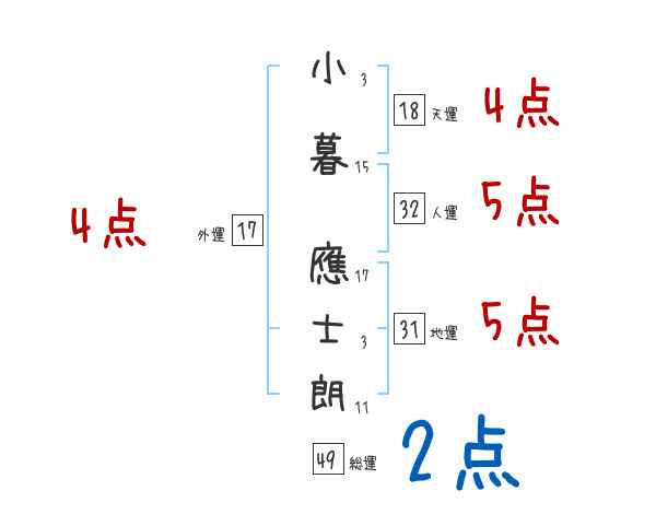 外運![]() | 小暮應士朗さんの外運は17画の4つ星!積極的な行動力。地位を気づき財産を手に入れる。純粋な心と直感力。 生活面を象徴する運勢です。外部から受ける影響力を表し、結婚運、家庭運や職場、環境への順応性を表します。 |