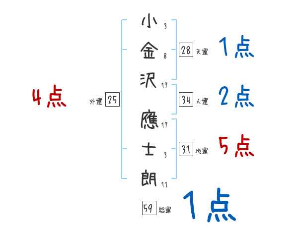 天運![]() | 小金沢應士朗さんの天運は28画の1つ星!家庭環境に注意。スポーツで活躍できる能力があるかも。 家系が持つ宿命的な運勢を表します。祖先から受け継いだ苗字ですので自分の力が及びません。家柄を象徴します。 |