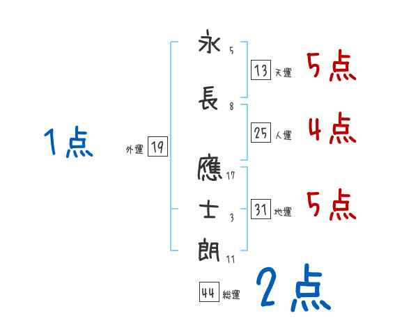 地運![]() | 永長應士朗さんの地運は31画の5つ星!社交性があり判断力に優れる。順風満帆な人生で円満な生活。 個性を表す基礎的な運勢です。性格形成や対人関係、行動力など家庭環境に影響されます。主に誕生してから20歳くらいまでの若年期の運勢を表します。 |