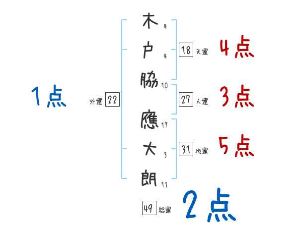 天運![]() | 木戸脇應大朗さんの天運は18画の4つ星!情熱的で剛気。忍耐力があり信頼される。 家系が持つ宿命的な運勢を表します。祖先から受け継いだ苗字ですので自分の力が及びません。家柄を象徴します。 |