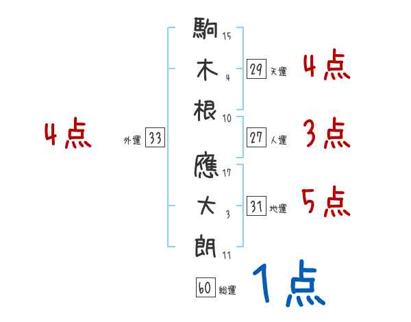 外運![]() | 駒木根應大朗さんの外運は33画の4つ星!権力志向でプライドが高い。勇気があり運を切り開き成功する。 生活面を象徴する運勢です。外部から受ける影響力を表し、結婚運、家庭運や職場、環境への順応性を表します。 |