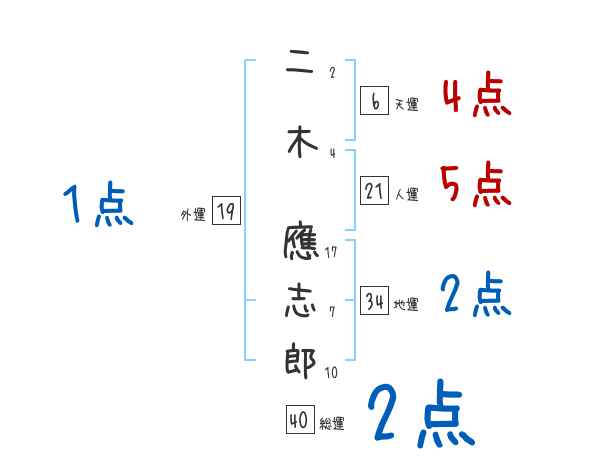 外運![]() | 二木應志郎さんの外運は19画の1つ星!優れた才能を持ちますが、協調性が足りないことも。周りの人と協力する事を意識しましょう。 生活面を象徴する運勢です。外部から受ける影響力を表し、結婚運、家庭運や職場、環境への順応性を表します。 |
