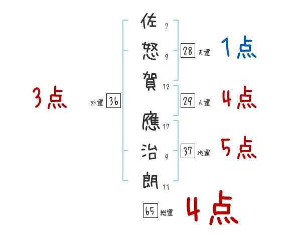 天運![]() | 佐怒賀應治朗さんの天運は28画の1つ星!家庭環境に注意。スポーツで活躍できる能力があるかも。 家系が持つ宿命的な運勢を表します。祖先から受け継いだ苗字ですので自分の力が及びません。家柄を象徴します。 |