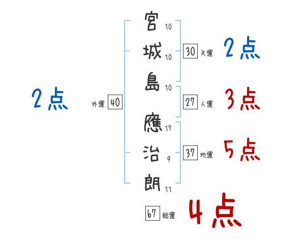 天運![]() | 宮城島應治朗さんの天運は30画の2つ星!浮き沈みの激しさに注意しましょう。 家系が持つ宿命的な運勢を表します。祖先から受け継いだ苗字ですので自分の力が及びません。家柄を象徴します。 |