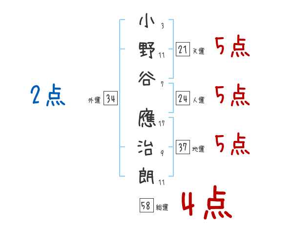 天運![]() | 小野谷應治朗さんの天運は21画の5つ星!統率力がある。独立し成功する。名誉を手に入れる。 家系が持つ宿命的な運勢を表します。祖先から受け継いだ苗字ですので自分の力が及びません。家柄を象徴します。 |