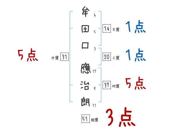 総運![]() | 牟田口應治朗さんの総運は51画の3つ星!変化が激しく、危険に注意。堅実な性格。 あなたの人生を表す1番重要な運勢です。生涯を通じて影響する総合運となり、主に50歳以降の晩年期に影響を及ぼします。 |
