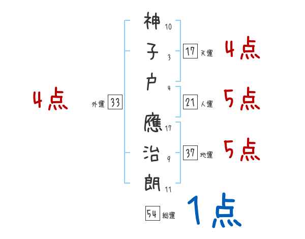 総運![]() | 神子戸應治朗さんの総運は54画の1つ星!トラブルが多いかも。周りをよく見て協調して過ごしましょう。 あなたの人生を表す1番重要な運勢です。生涯を通じて影響する総合運となり、主に50歳以降の晩年期に影響を及ぼします。 |