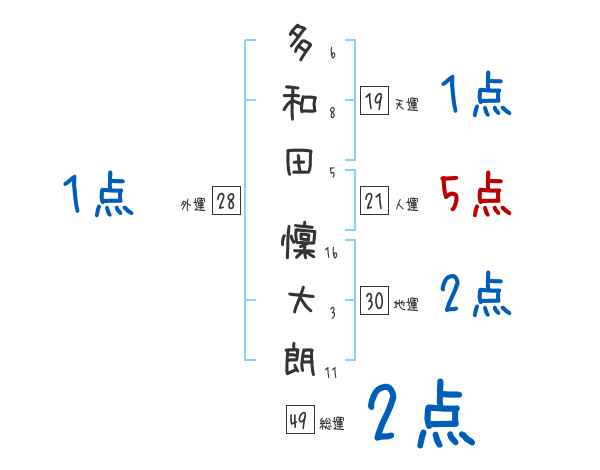 総運![]() | 多和田懍大朗さんの総運は49画の2つ星!不安定な性格で明暗がある人生。周りの人には支援されやすい。 あなたの人生を表す1番重要な運勢です。生涯を通じて影響する総合運となり、主に50歳以降の晩年期に影響を及ぼします。 |