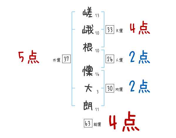 天運![]() | 嵯峨根懍大朗さんの天運は33画の4つ星!権力志向でプライドが高い。勇気があり運を切り開き成功する。 家系が持つ宿命的な運勢を表します。祖先から受け継いだ苗字ですので自分の力が及びません。家柄を象徴します。 |