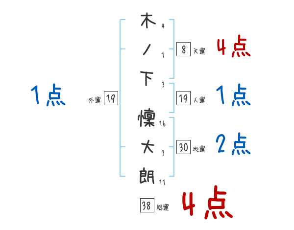 外運![]() | 木ノ下懍大朗さんの外運は19画の1つ星!優れた才能を持ちますが、協調性が足りないことも。周りの人と協力する事を意識しましょう。 生活面を象徴する運勢です。外部から受ける影響力を表し、結婚運、家庭運や職場、環境への順応性を表します。 |