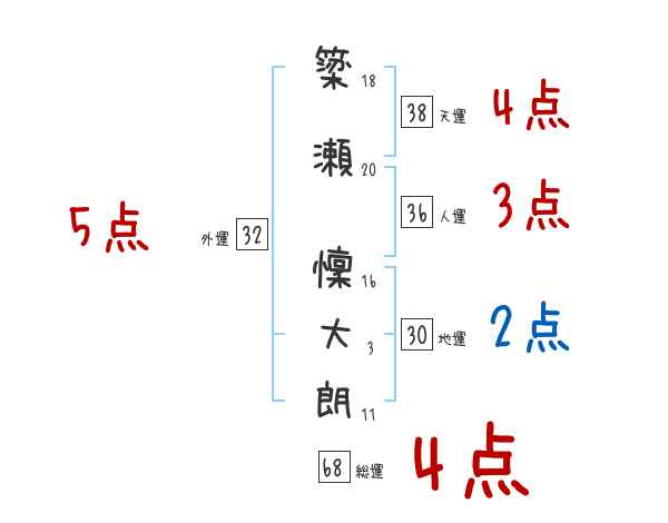 外運![]() | 簗瀬懍大朗さんの外運は32画の5つ星!柔軟性があり成功する。チャンスが多く金運が良い。 生活面を象徴する運勢です。外部から受ける影響力を表し、結婚運、家庭運や職場、環境への順応性を表します。 |