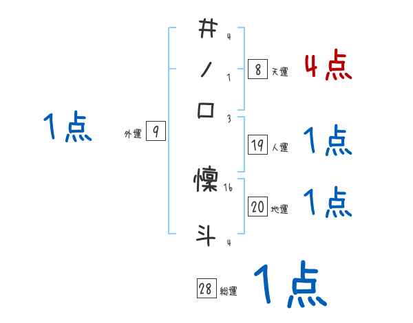総運![]() | 井ノ口懍斗さんの総運は28画の1つ星!家庭環境に注意。スポーツで活躍できる能力があるかも。 あなたの人生を表す1番重要な運勢です。生涯を通じて影響する総合運となり、主に50歳以降の晩年期に影響を及ぼします。 |