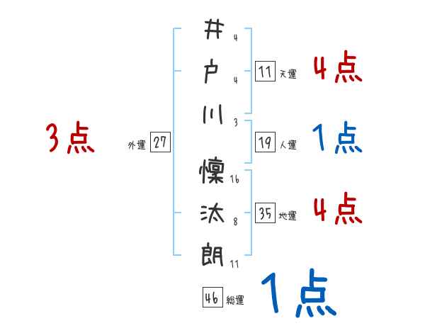 天運![]() | 井戸川懍汰朗さんの天運は11画の4つ星!着実に富や地位を得る幸運な人生。 家系が持つ宿命的な運勢を表します。祖先から受け継いだ苗字ですので自分の力が及びません。家柄を象徴します。 |