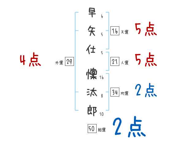 天運![]() | 早矢仕懍汰郎さんの天運は16画の5つ星!人望が厚く大きく発展する。逆転成功が見える。 家系が持つ宿命的な運勢を表します。祖先から受け継いだ苗字ですので自分の力が及びません。家柄を象徴します。 |