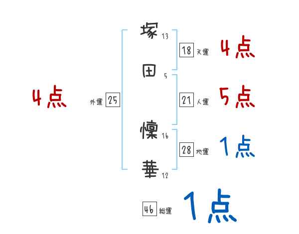 天運![]() | 塚田懍華さんの天運は18画の4つ星!情熱的で剛気。忍耐力があり信頼される。 家系が持つ宿命的な運勢を表します。祖先から受け継いだ苗字ですので自分の力が及びません。家柄を象徴します。 |