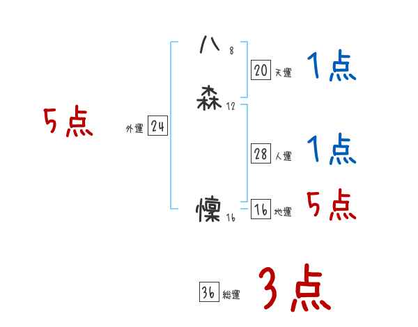 外運![]() | 八森懍さんの外運は24画の5つ星!家庭運が良く順調な人生。金運にも恵まれる。 生活面を象徴する運勢です。外部から受ける影響力を表し、結婚運、家庭運や職場、環境への順応性を表します。 |