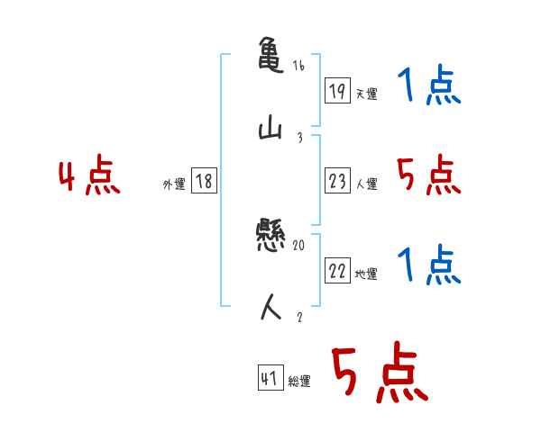 天運![]() | 亀山懸人さんの天運は19画の1つ星!優れた才能を持ちますが、協調性が足りないことも。周りの人と協力する事を意識しましょう。 家系が持つ宿命的な運勢を表します。祖先から受け継いだ苗字ですので自分の力が及びません。家柄を象徴します。 |
