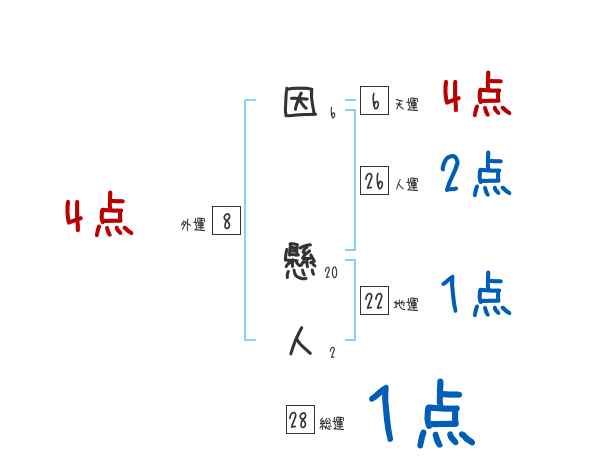 人運![]() | 因懸人さんの人運は26画の2つ星!波瀾万丈かも。信頼できる人を大事にしましょう。 性格や才能などを表す2番目に重要な運勢です。人間関係や協調性、社会的な成功に影響します。主に20歳から50歳ぐらいまでの中年期の運勢を表します。 |