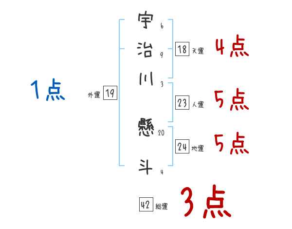 外運![]() | 宇治川懸斗さんの外運は19画の1つ星!優れた才能を持ちますが、協調性が足りないことも。周りの人と協力する事を意識しましょう。 生活面を象徴する運勢です。外部から受ける影響力を表し、結婚運、家庭運や職場、環境への順応性を表します。 |