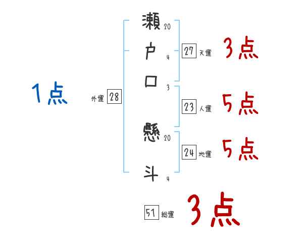 総運![]() | 瀬戸口懸斗さんの総運は51画の3つ星!変化が激しく、危険に注意。堅実な性格。 あなたの人生を表す1番重要な運勢です。生涯を通じて影響する総合運となり、主に50歳以降の晩年期に影響を及ぼします。 |