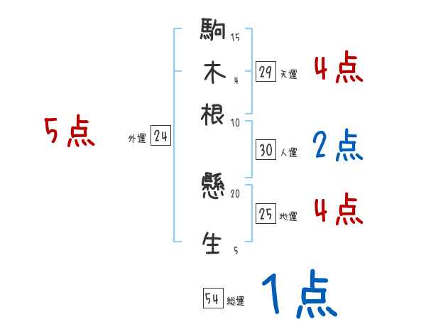 総運![]() | 駒木根懸生さんの総運は54画の1つ星!トラブルが多いかも。周りをよく見て協調して過ごしましょう。 あなたの人生を表す1番重要な運勢です。生涯を通じて影響する総合運となり、主に50歳以降の晩年期に影響を及ぼします。 |