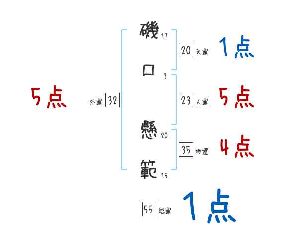 人運![]() | 磯口懸範さんの人運は23画の5つ星!想像力に優れ活力がある。一代で成功し名誉を手に入れる。 性格や才能などを表す2番目に重要な運勢です。人間関係や協調性、社会的な成功に影響します。主に20歳から50歳ぐらいまでの中年期の運勢を表します。 |