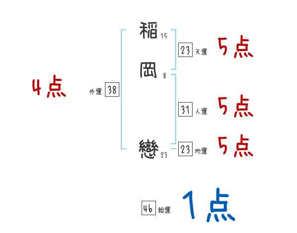 天運![]() | 稲岡戀さんの天運は23画の5つ星!想像力に優れ活力がある。一代で成功し名誉を手に入れる。 家系が持つ宿命的な運勢を表します。祖先から受け継いだ苗字ですので自分の力が及びません。家柄を象徴します。 |