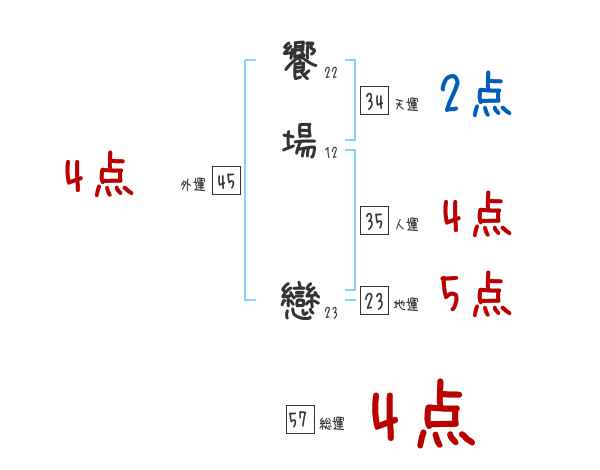 総運![]() | 饗場戀さんの総運は57画の4つ星!向上心があり人望がある。地位を得る。 あなたの人生を表す1番重要な運勢です。生涯を通じて影響する総合運となり、主に50歳以降の晩年期に影響を及ぼします。 |