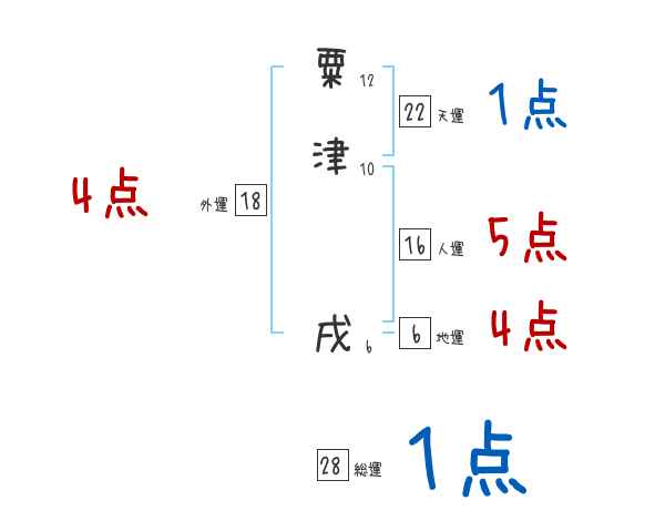 天運![]() | 粟津戌さんの天運は22画の1つ星!努力することが苦手ないっぽう手先が器用。芸術性にも優れる。 家系が持つ宿命的な運勢を表します。祖先から受け継いだ苗字ですので自分の力が及びません。家柄を象徴します。 |