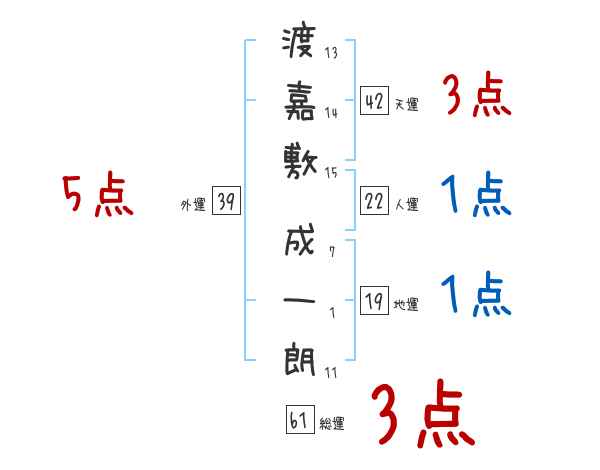 外運![]() | 渡嘉敷成一朗さんの外運は39画の5つ星!社交性に優れ人望が厚い。人の上に立ち成功する。 生活面を象徴する運勢です。外部から受ける影響力を表し、結婚運、家庭運や職場、環境への順応性を表します。 |